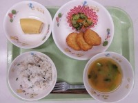 黒糖パン、鮭のムニエル、キャベツといんげんのサラダ、卵とほうれん草のスープ、デコポン