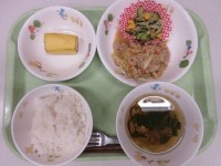 三色ごはん、キャベツとほうれん草のごまあえ、なめこ汁、ニューサマーオレンジ