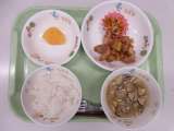 ご飯、さつま芋と鶏肉のからめ煮、もやしの甘酢あえ、みそ汁、柿
