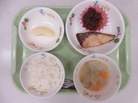ごはん、ぶりの照り焼き、かぼちゃのいとこ煮、とん汁、りんご