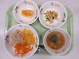 牛乳、三色ご飯、キャベツと大豆の和風サラダ、なめこ汁、オレンジ