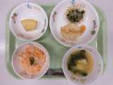 牛乳、鮭ごはん、じゃがいものそぼろ煮、ほうれん草と菊のサラダ、すまし汁、梨