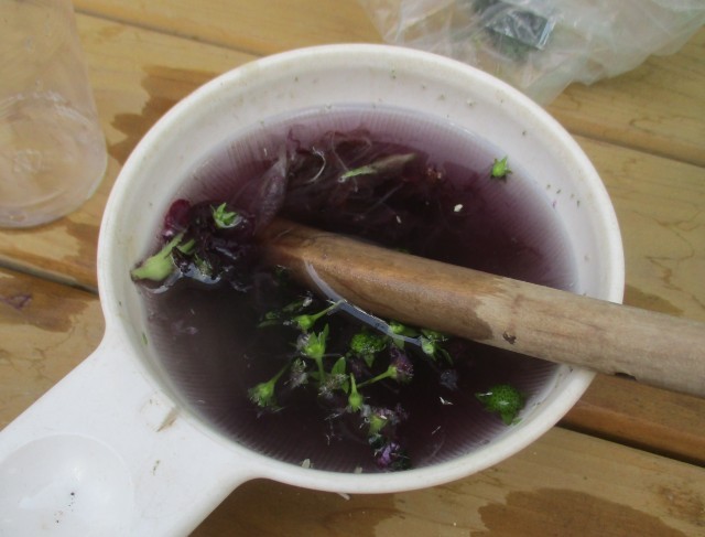 1学期に種を植えて育てた朝顔が花を咲かせ、喜んでいた子どもたち。最近ではしおれてきた花弁を使った色水遊びを楽しんでいます。使う花弁、水の量、すり鉢・すりこ木の使い方(力の入れ方)などによって、少しずつ異なる色水ができます。色水を作る過程にも楽しみや発見がいっぱい、そしてできあがった色水を並べてみると新たな嬉しさや発見がいっぱいです。花弁の他に、雑草を使った色水作りも楽しんでいます。「♪雑草♪雑草♪」と不思議な歌を歌いながら、どの草を使おうか選んでいる姿がほほ笑ましい4歳児うさぎ組です。