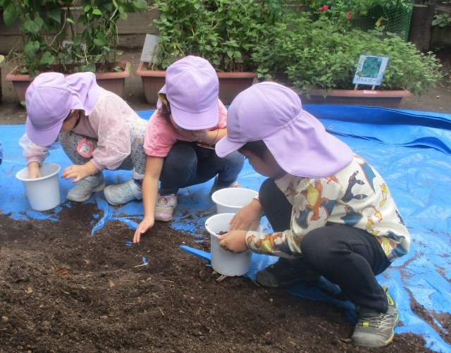 急に気温が下がってきました。気温が下がってくると、春に咲く花の球根の植えどきです。今日は、地域の栽培指導者の方にいらしていただき、植物がよく育つように土を混ぜたり、植木鉢に植えるときの方法を教えていただいたりしながら、一人一鉢ずつ球根を植えました。みんなが一つ大きい組になる頃に咲くお花たちです。これから大事に育てていきましょう。