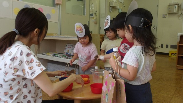 ◆そこまで縁日ごっこを楽しんでいたのならば、あひる組でもう1度行おう!とクラスでの縁日ごっこを計画しました。1人1枚紙袋を持ち、ヨーヨー・ボールすくい、お面、ジュース・ドーナツ屋のコーナーを好きなように回ります。紙袋を持って「わーいわーい」と言って歩き回ったり、友達と顔を見合わせて「おまつり たのしいね」と言ったり、どの子どももクラスでの縁日ごっこを楽しんでいます。