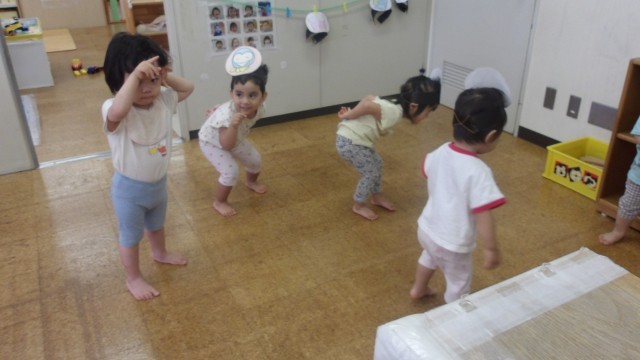 ◆紙袋が一杯になった頃「せんせい ぼんおどりは?」と盆踊り大会のリクエスト。縁日ごっこ同様に「月夜のポンチャラリン」「もったいないばあさん音頭」を踊ります。手拍子や頭の上で丸を作るところ、おばあさんのように腰を曲げるところは完璧です!盆踊りが終わり、最後は拍手をしてあひる組での縁日ごっこは終了です!