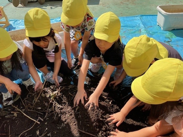 ♦山田さんに「みんなでこねてみよう!」と言われると嬉しそうに土の山の近くへ行き、土づくりを始めます。土に触れると「気持ちいいね」「やわらかいね」と五感を感じながら土を混ぜることを楽しんでいます。土の中から虫や球根など宝物が発見される度に目を輝かせ、大興奮の子どもたちです!
