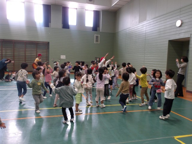 ◆楽器の音や語りの世界に触れることで、子どもたちの好奇心も広がり、子どもたちが参加しながら楽しみ自然とたくさん遊びたくなる工夫がちりばめられています。終わりまで何が出てくるかドキドキ!ワクワク笑顔がいっぱいでした。最後は、全員で1つの輪になって踊って盛り上がっています。