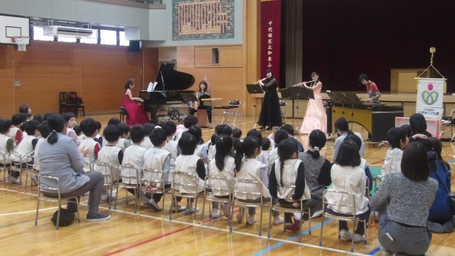 ♦PTAからのお祝いで野仲音楽事務所によるコンサートが開催され、プロの音楽家による生演奏を楽しんでいます。馴染みのある「となりのトトロ」やいずみポケットシアターで歌った「コンパス オブ ユア ハート」の歌が流れると歓声があがり、一緒に歌を歌っている子どもたちです。楽器の音色と子どもたちの歌声が一体となり素敵な時間です。