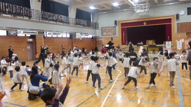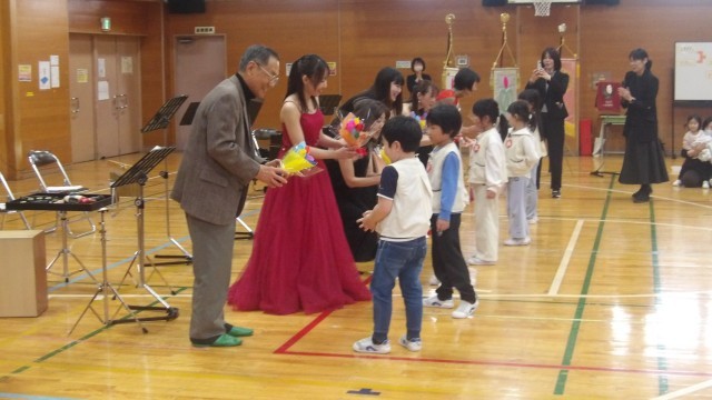 ♦音楽家の方から、「ちきゅうをまもるよ ピカレンジャー」や「夏祭り」の曲の紹介があると大喜びの子どもたちで、体育館いっぱいに広がり身体をいっぱいに動かし踊っています。そして子どもたち同士、顔を見合わせながらにこにこ踊り楽しい時間です。あっという間に時間が経ち、最後に「いずみこども園園歌」を元気いっぱい歌い、満足気な表情の子どもたちです。演奏していただいた野仲音楽事務所の方々にゆり組から「ありがとう」の気持ちを込めて、手作りの花束をプレゼントしています。