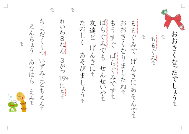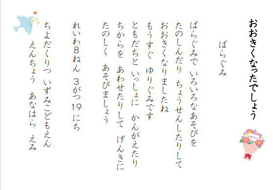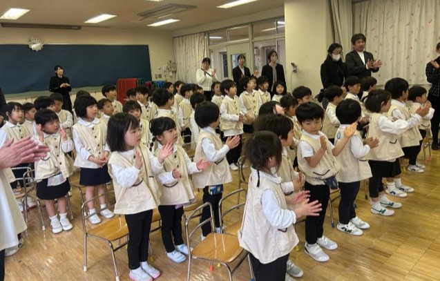 ◆令和8年3月19日、3歳児もも組と4歳児ばら組の第三学期終業式です。前日に、立派な姿でこども園の修了式を迎えた5歳児ゆり組は、本日より春季休業日です。ゆり組さんがいない寂しさも感じる中、自分たちの1年の成長を振り返り、4月の進級への期待を高めます。