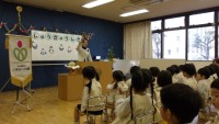 ◆5歳児ゆり組さんの修了が近付いています。大好きなゆり組さんに「ありがとう」と「おめでとう」の気持ちを届けるために、4歳児ばら組が3歳児もも組をリードしてお別れ会を企画しました。きれいに飾り付けられた玄関ホールにゆり組さんをお招きし、一緒に楽しいひと時を過ごしました。